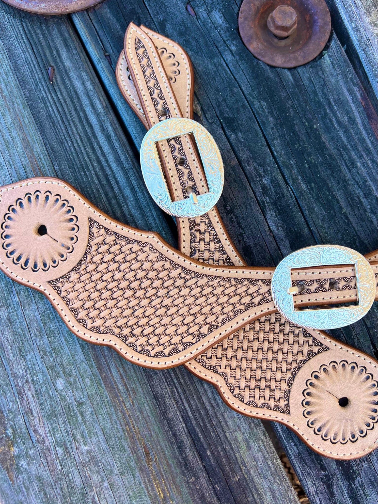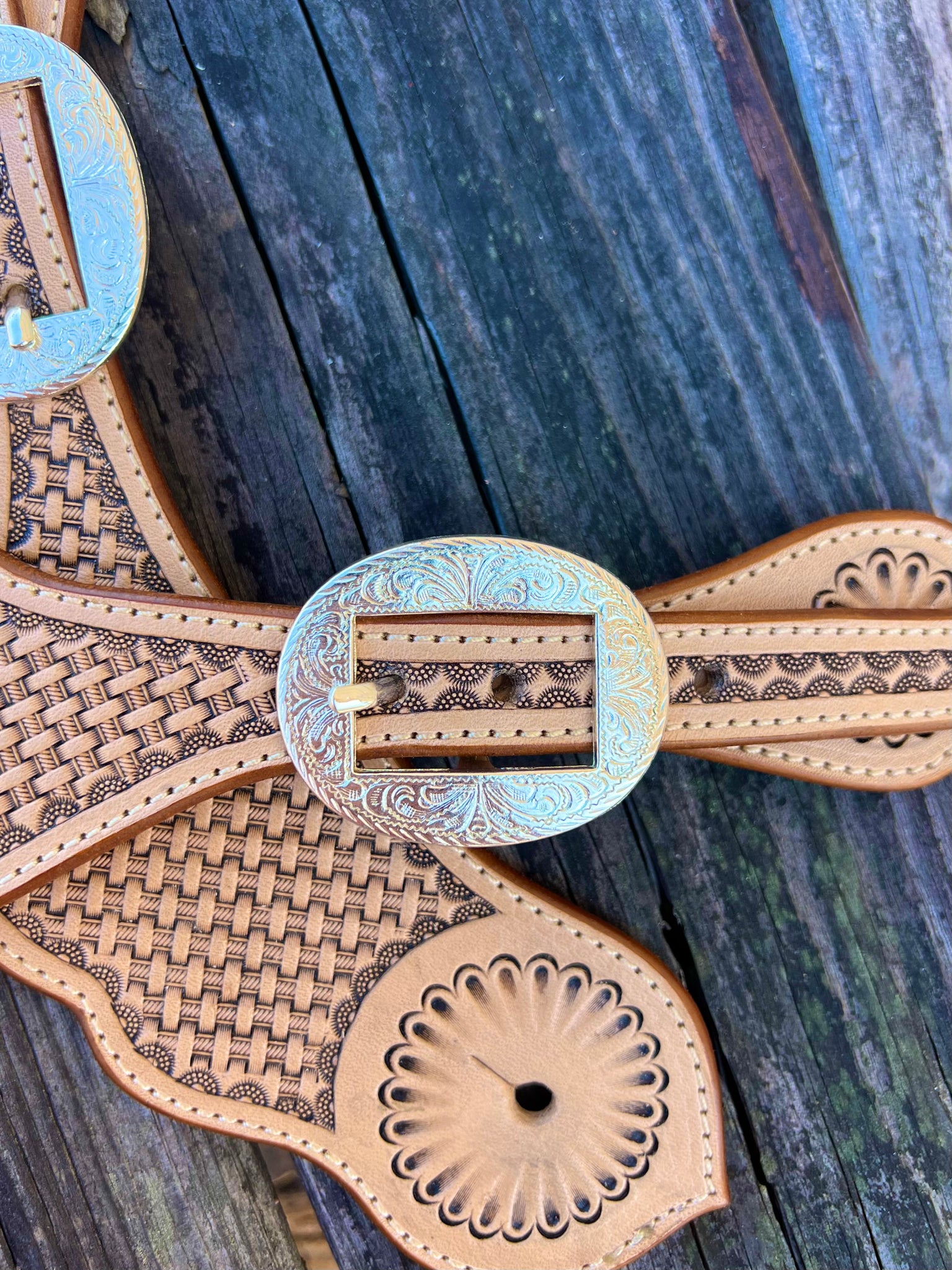 Handmade Basket Stamped spur straps including a removable cart buckle on each set. These are an all natural, antiqued color scheme that will darken with age and use. These will patina beautifully over time and are meant to break in, not wear out.