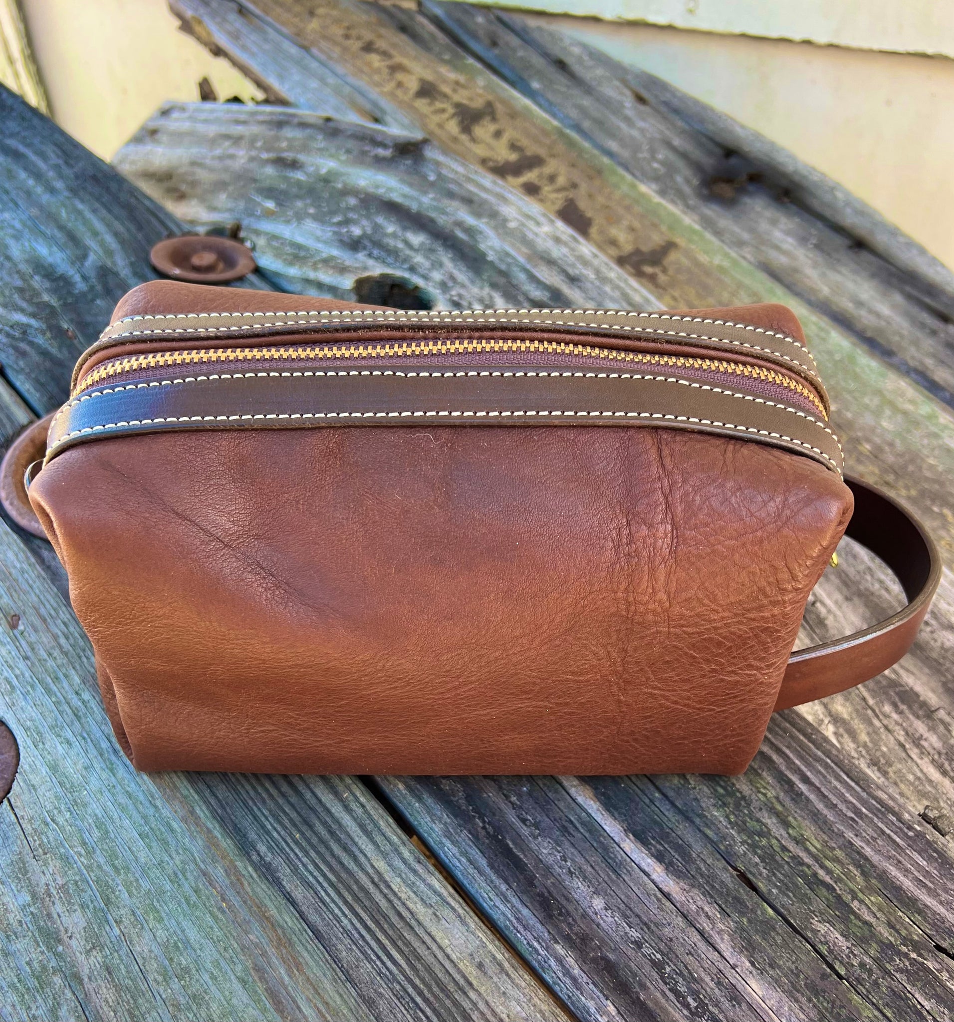 A handmade leather Dopp kit constructed with Hermann Oak Heritage 1881 Leather. This is a luxurious dark chocolate leather 100% vegetable tanned, but has the soft and pliable feel of chrome tan leather. It is also water resistant! Fully lined with no raw leather edges showing. #5 YKK Brown/Brass zipper.